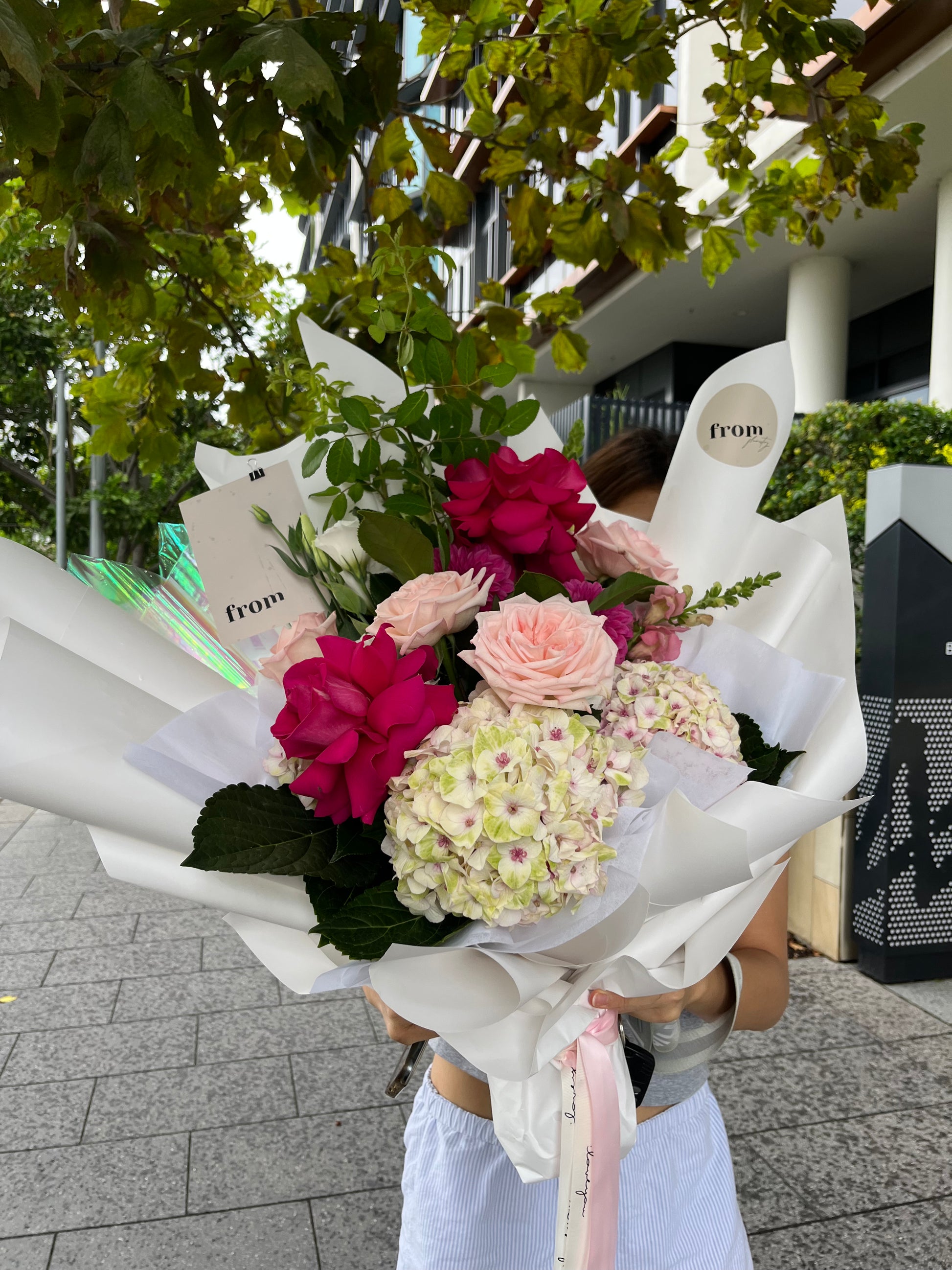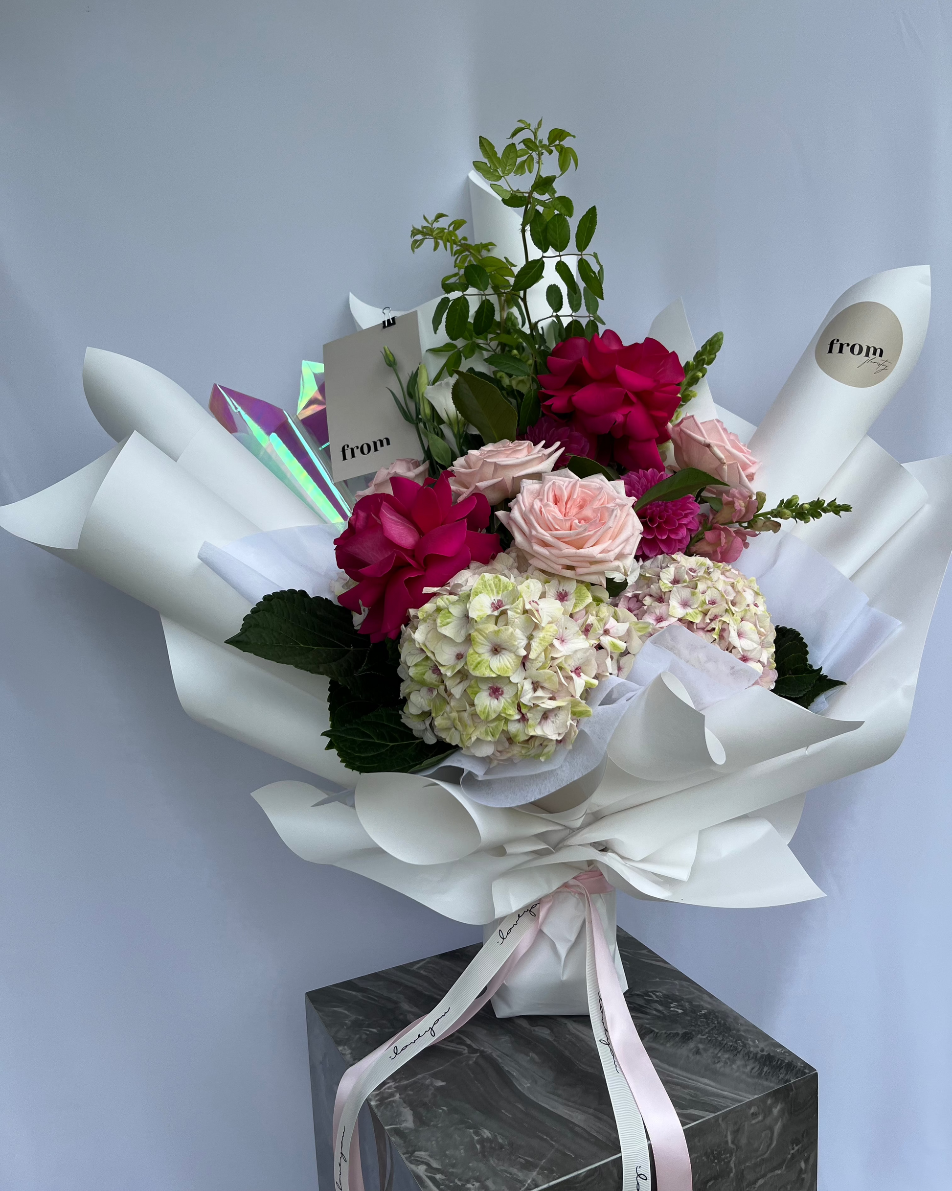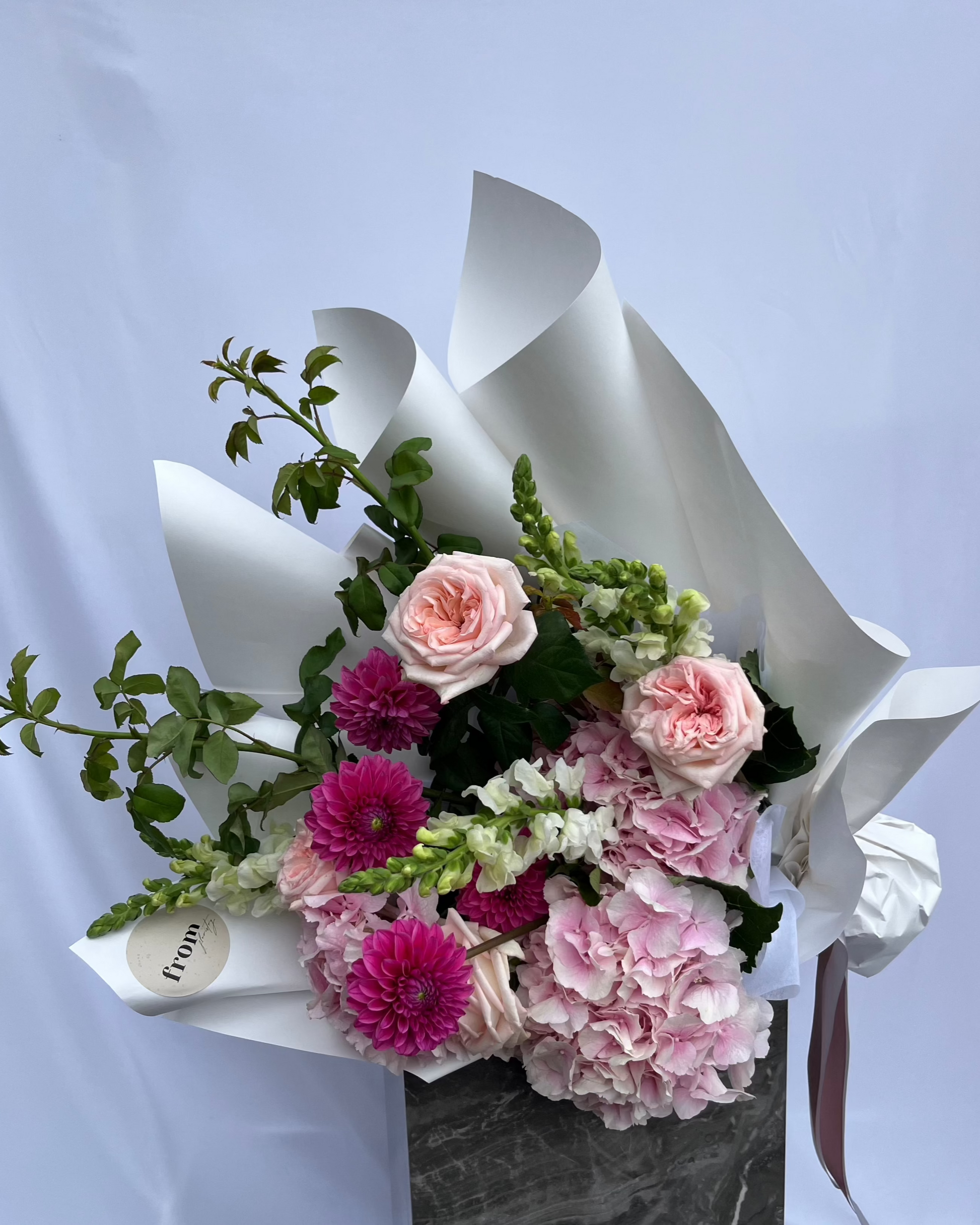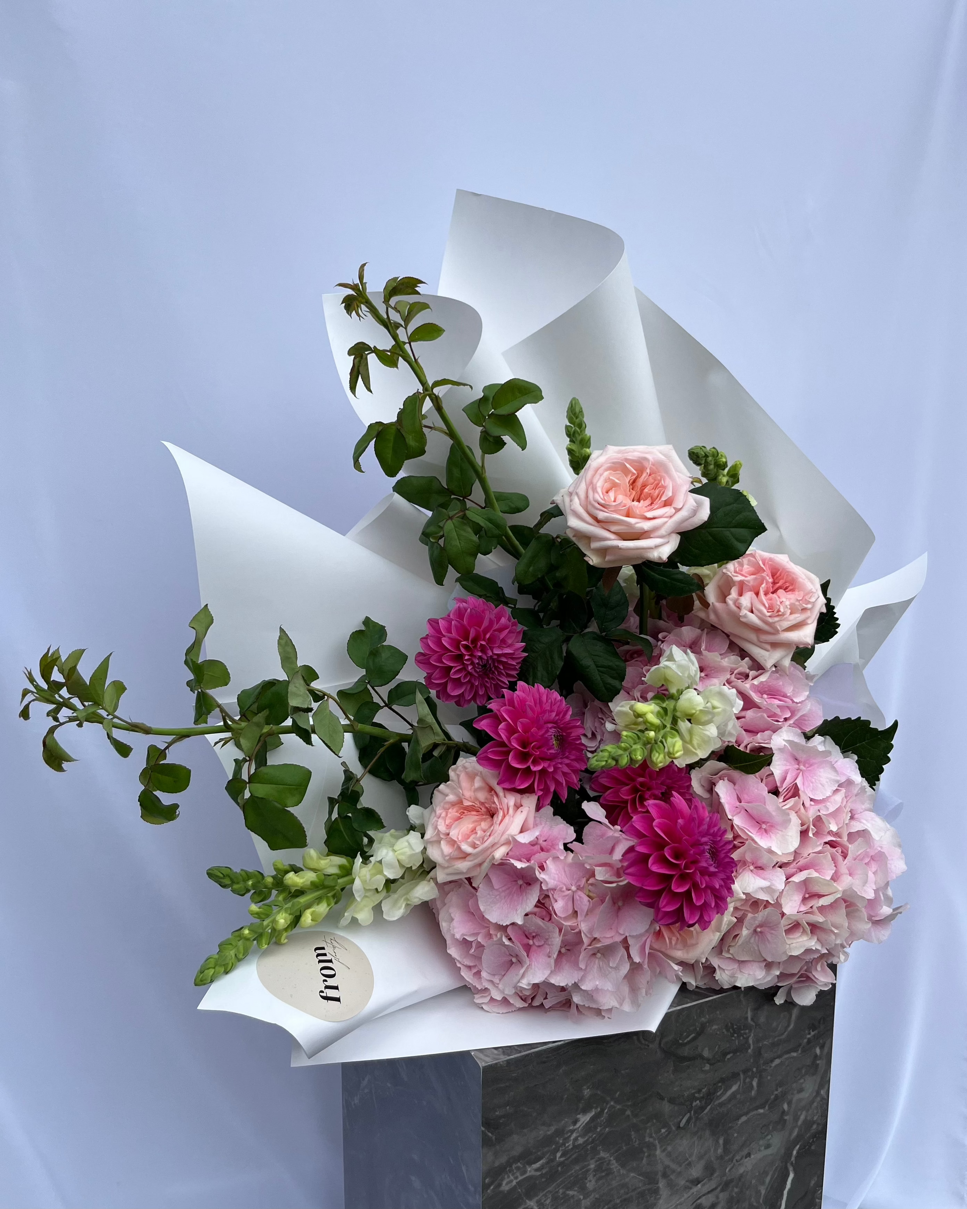 'Pinky promise' is an artistic curation of pink, white and green florals. Included florals will depend on season, so any varieties aren't guaranteed. All orders come with flower food and a fromfloristry card. 'Overflowing' and 'Ultimate' bouquets will always include a long-lasting orchid.